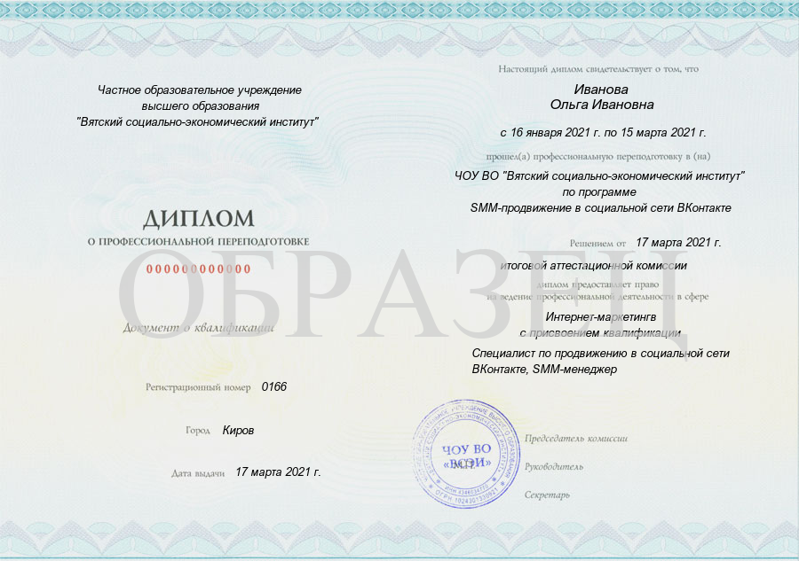 По окончании обучения выдается диплом о профессиональной переподготовке установленного образца, который высылается Почтой России (доставка бесплатная).